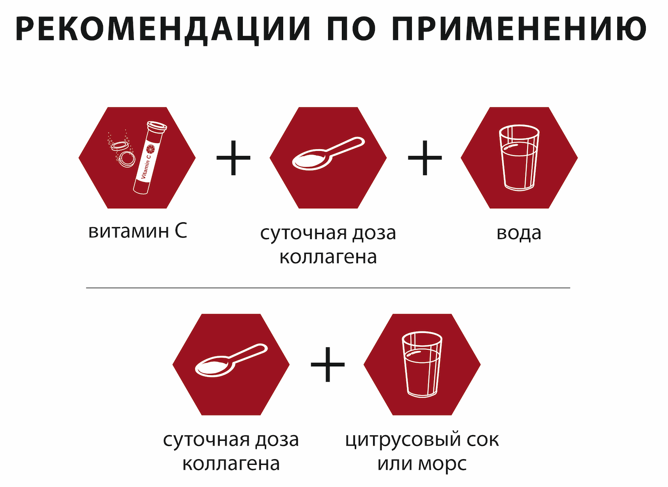 Коллаген в порошке принимать внутрь, учитывая, что сочетание с витамином С и гиалуроновой кислотой и прием натощак за час до еды значительно повышают скорость усвоения коллагена в организме человека.