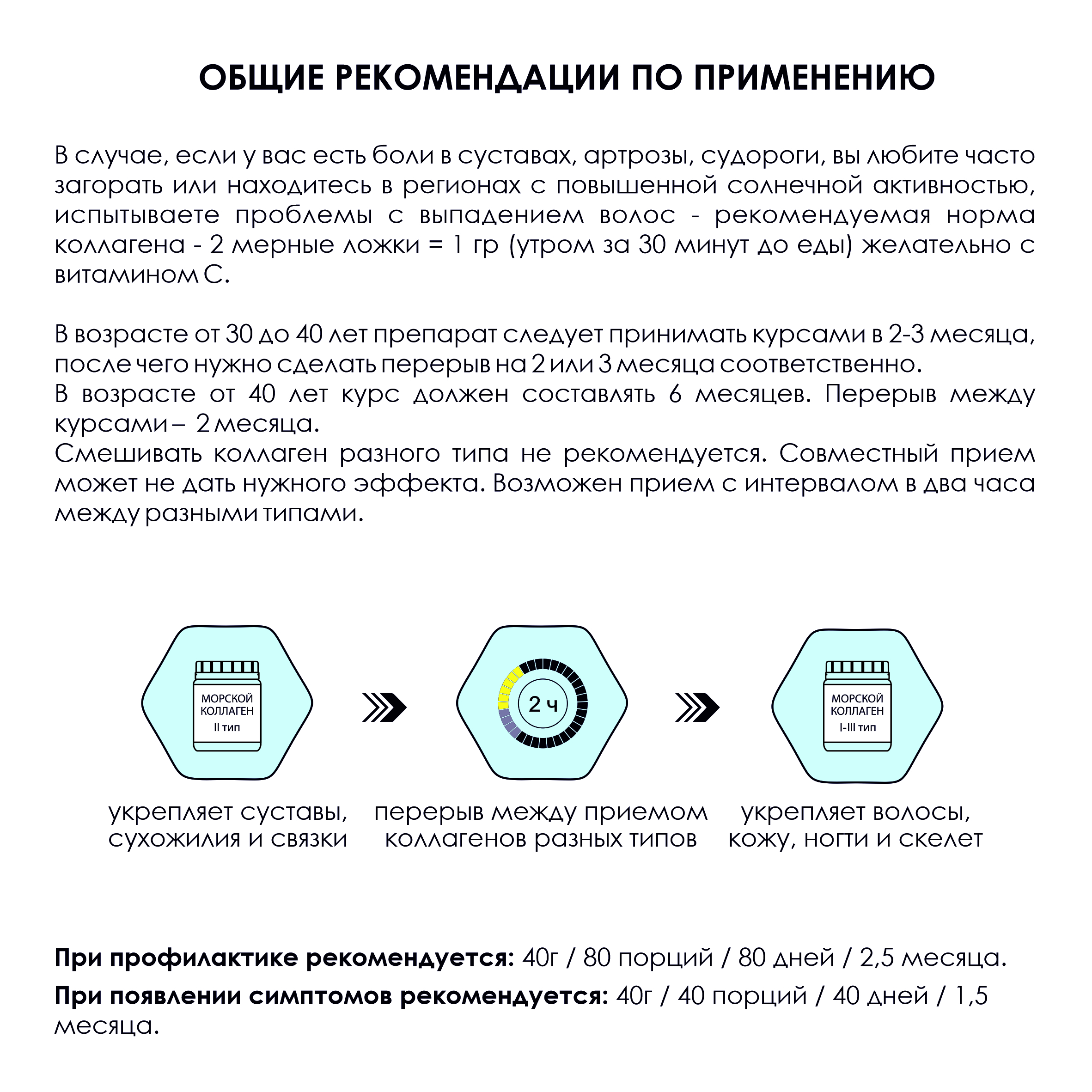 Продолжительность приема определяется возрастом, массой тела и интенсивностью физических нагрузок, и зависит от типа коллагена: